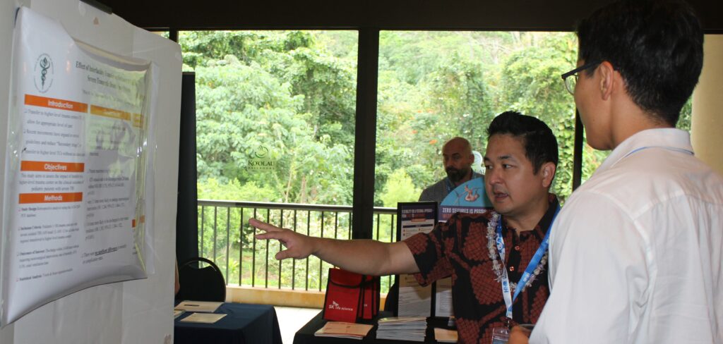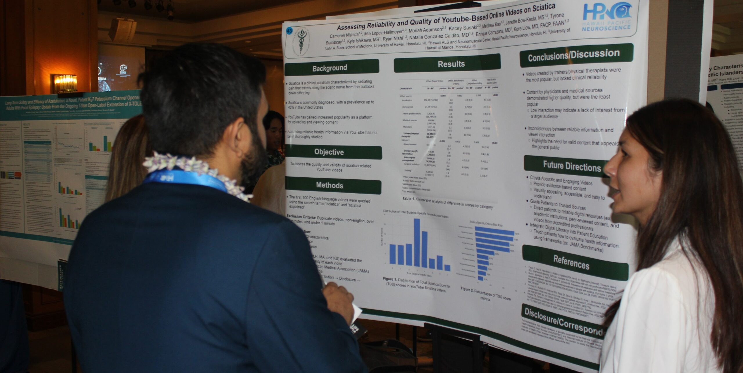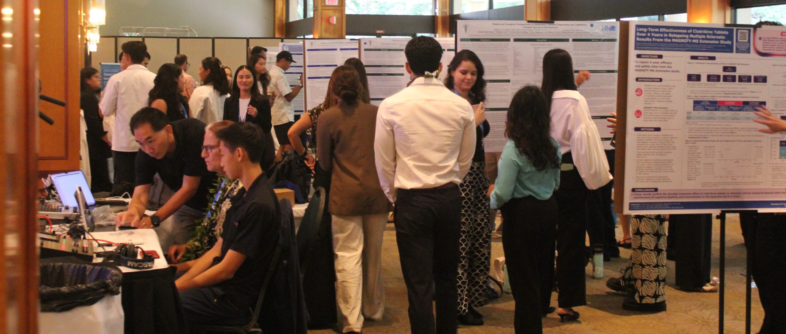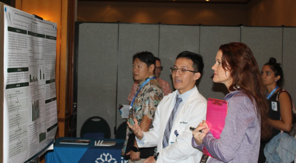 Packed Sold out Capacity Symposium with med student Cameron Nishida’s group presenting findings to neurologist Viren Patel, MD, while med student Phillip Lee present his findings to neurosurgeon Reid Hoshide, MD, (Below),  1 of over 40 research posters presented at the 2025 symposium.