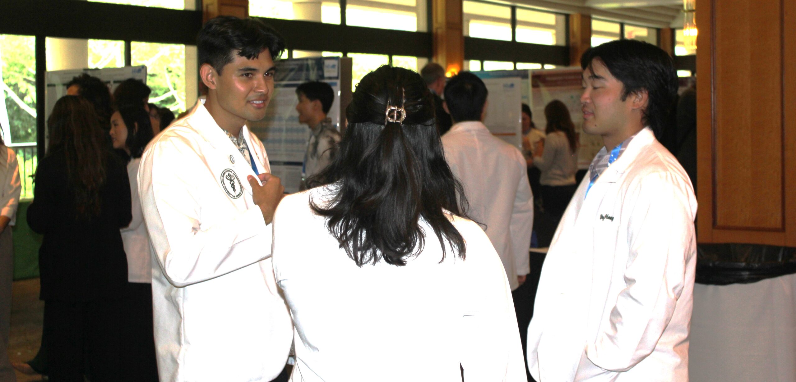 Med Student Kevin Nguyen explaining his research findings to psychiatrist Janette Abramowitz, MD, Dean Sam Shomaker, MD, Professor and Dean, University of Hawai`i John Burns School of Medicine